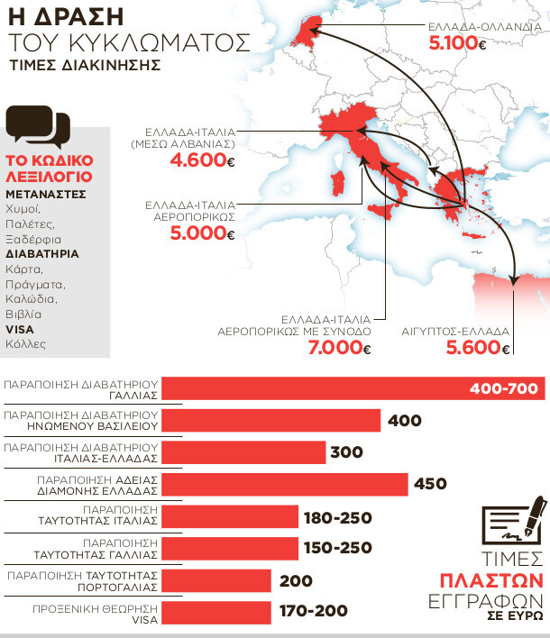 Για κάθε πλαστό ταξιδιωτικό έγγραφο υπήρχε συγκεκριμένη τιμολόγηση. Από 400-700 ευρώ κόστιζε η παραποίηση διαβατηρίου Γαλλίας, 400 ευρώ του Ηνωμένου Βασιλείου και 300 ευρώ της Ελλάδας και της Ιταλίας. Η παραποίηση άδειας διαμονής στην Ελλάδα κόστιζε στους μετανάστες 450 ευρώ και η προξενική θεώρηση VISA 170-200. Οσον αφορά στις «μαϊμού» ταυτότητες, αυτές της Ιταλίας και της Γαλλίας κόστιζαν έως και 250 ευρώ, ενώ της Πορτογαλίας 200. Ηταν τόσο μαζική η παραγωγή των παράτυπων ταξιδιωτικών εγγράφων, που κατά τη διάρκεια των ερευνών οι γερμανικές αρχές είχαν εντοπίσει ταχυδρομικά δέματα του κυκλώματος με μεγάλη ποσότητα πλαστών διαβατηρίων.