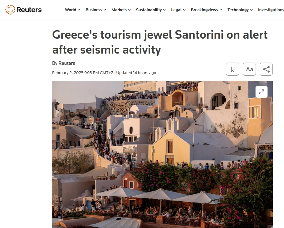 «Οι ελληνικές αρχές προειδοποίησαν για αύξηση της σεισμικής δραστηριότητας γύρω από το τουριστικό νησί της Σαντορίνης, συμβουλεύοντας τον κόσμο να αποφύγει τέσσερα λιμάνια, να αδειάσει τις πισίνες, να απέχει από τις συγκεντρώσεις σε κλειστούς χώρους και να κλείσουν τα σχολεία τη Δευτέρα.