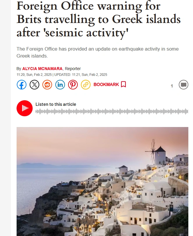 Όπως σημειώνει το άρθρο, το Υπουργείο Εξωτερικών εξέδωσε προειδοποίηση για τους Βρετανούς που ταξιδεύουν σε μέρη της Ελλάδας μετά την ανίχνευση σεισμικής δραστηριότητας.