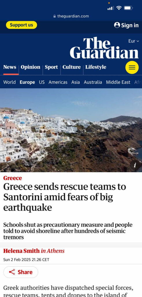 «Η Σαντορίνη γνωρίζει από σεισμούς, καθώς βρίσκεται πάνω σε πολλές ρηγματωμένες ζώνες. Ωστόσο, ο κίνδυνος των σεισμών δεν σταματά τα περίπου 3,4 εκατομμύρια άτομα που επισκέπτονται το νησί κάθε χρόνο — αριθμός που ξεπερνά κατά πολύ τους περίπου 20.000 κατοίκους της.»