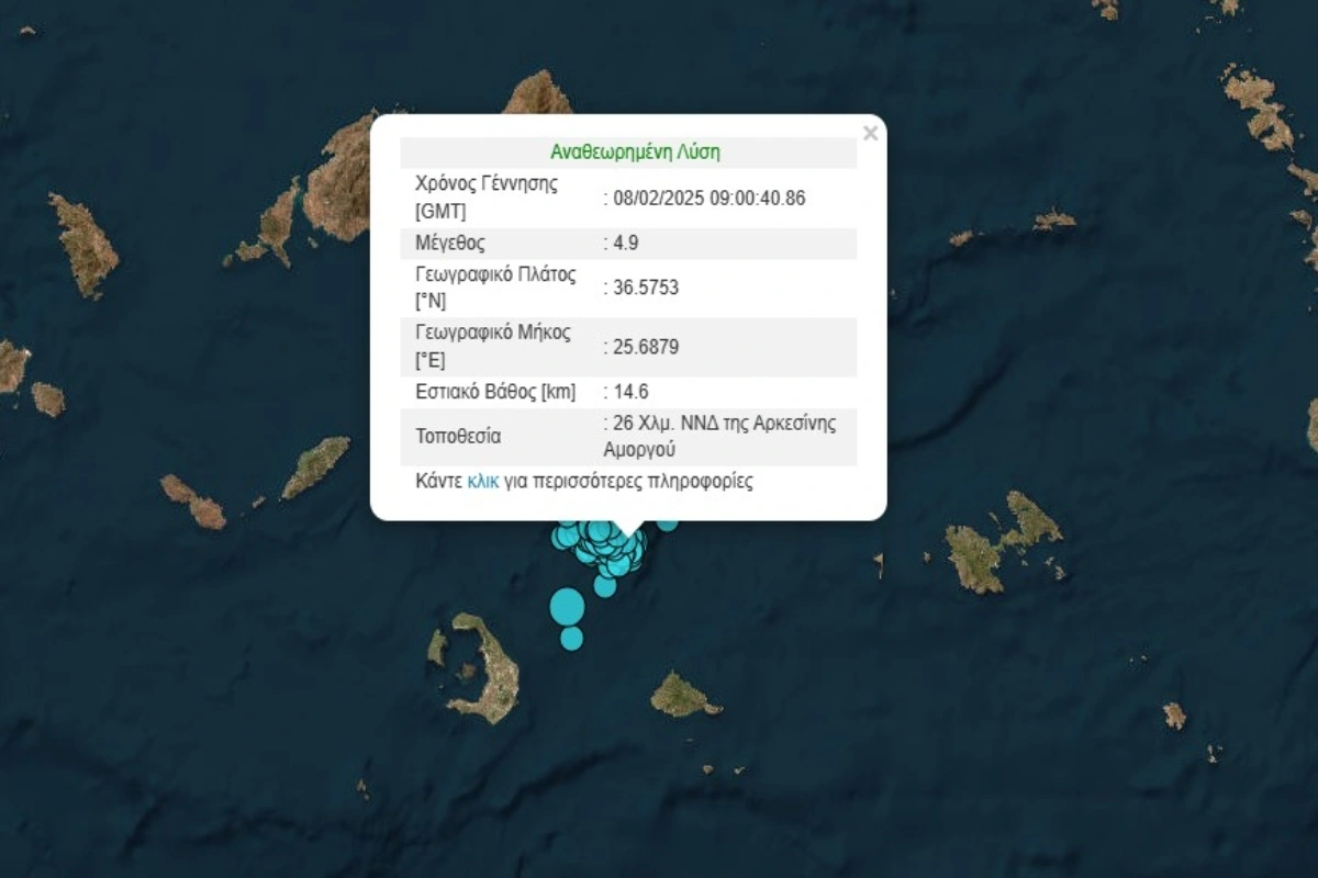 Τρεις σεισμικές δονήσεις, οι δύο από τις οποίες ήταν μεγέθους 4,1 βαθμών της κλίμακας Ρίχτερ και μια 4,4, καταγράφτηκαν στον θαλάσσιο χώρο 17-26 χιλιόμετρα νότια-νοτιοδυτικά της κοινότητας Αρκεσίνης Αμοργού τις πρώτες πρωινές ώρες —με αντίστροφη χρονολογική σειρά στις 05:11, στις 05:08 και στις 03:52—, κατά δεδομένα που δημοσιοποίησε το Γεωδυναμικό Ινστιτούτο του Εθνικού Αστεροσκοπείου της Αθήνας.