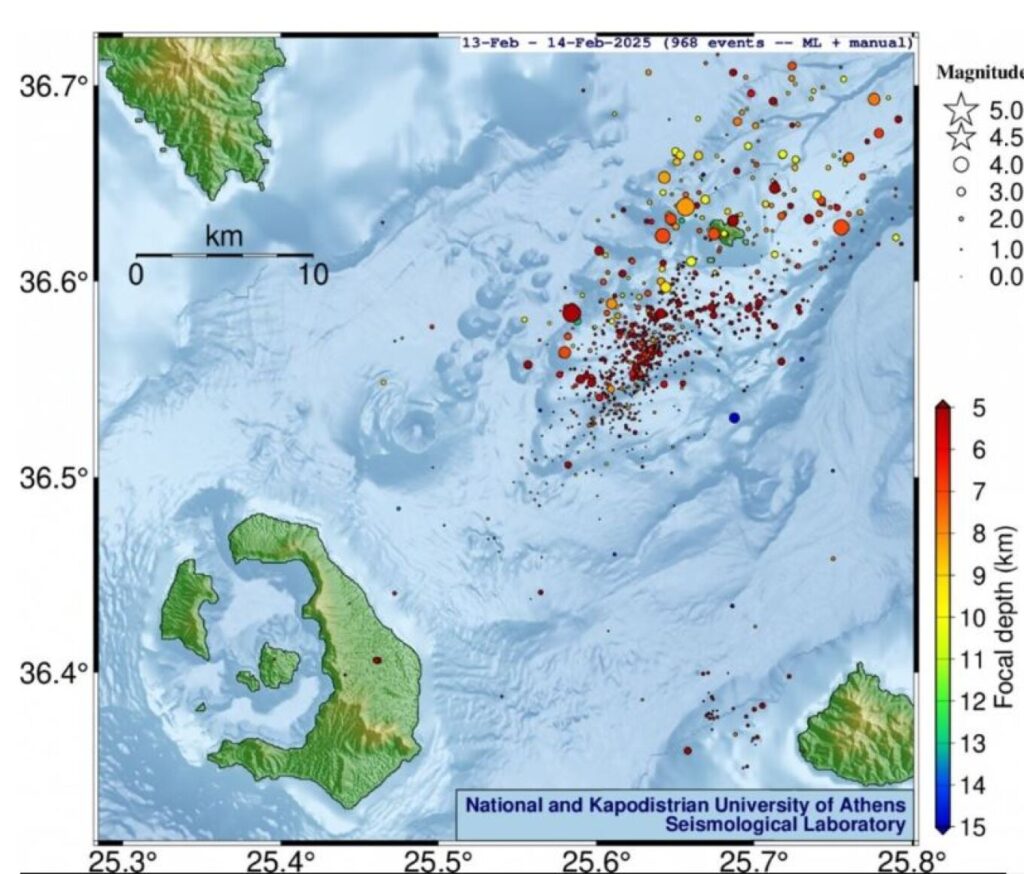 Από την έναρξη της σεισμικής δραστηριότητας στη ζώνη Σαντορίνης-Αμοργού στις 26 Ιανουαρίου έως και τις 13 Φεβρουαρίου 2025, το Εργαστήριο Σεισμολογίας (ΕΣ) του ΕΚΠΑ (http://dggsl.geol.uoa.gr/) έχει ανιχνεύσει και εντοπίσει συνολικά πάνω από 18,400 επιλεγμένους σεισμούς με μεθόδους μηχανικής μάθησης (τεχνητής νοημοσύνης), εκ των οποίων άνω των 16,200 με μεγέθη Μ≥1.0. Στις 13 Φεβρουαρίου καταγράφηκαν πάνω από 800 σεισμοί, με ~40 να έχουν μέγεθος Μ≥2.5, 2 σεισμούς με Μ≥4.0, και κανέναν (0) σεισμό με Μ≥4.5, με τους δύο μεγαλύτερους σεισμούς να έχουν μέγεθος 4.4.