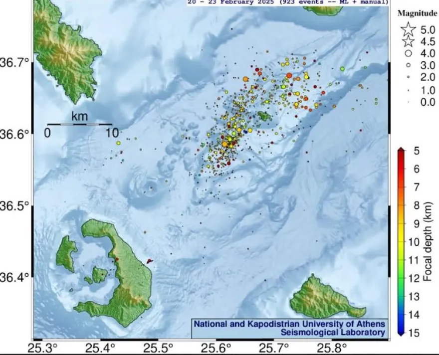 Από την έναρξη της σεισμικής δραστηριότητας στη ζώνη Σαντορίνης – Αμοργού στις 26 Ιανουαρίου έως και τις 22 Φεβρουαρίου 2025, το Εργαστήριο Σεισμολογίας (ΕΣ) του ΕΚΠΑ (http://dggsl.geol.uoa.gr/) έχει ανιχνεύσει και εντοπίσει συνολικά, με αυστηρά κριτήρια για τη διασφάλιση της ποιότητας των αποτελεσμάτων, πάνω από 23,500 σεισμούς με μεθόδους μηχανικής μάθησης (τεχνητής νοημοσύνης), εκ των οποίων άνω των 20,000 με μεγέθη Μ³1.0.