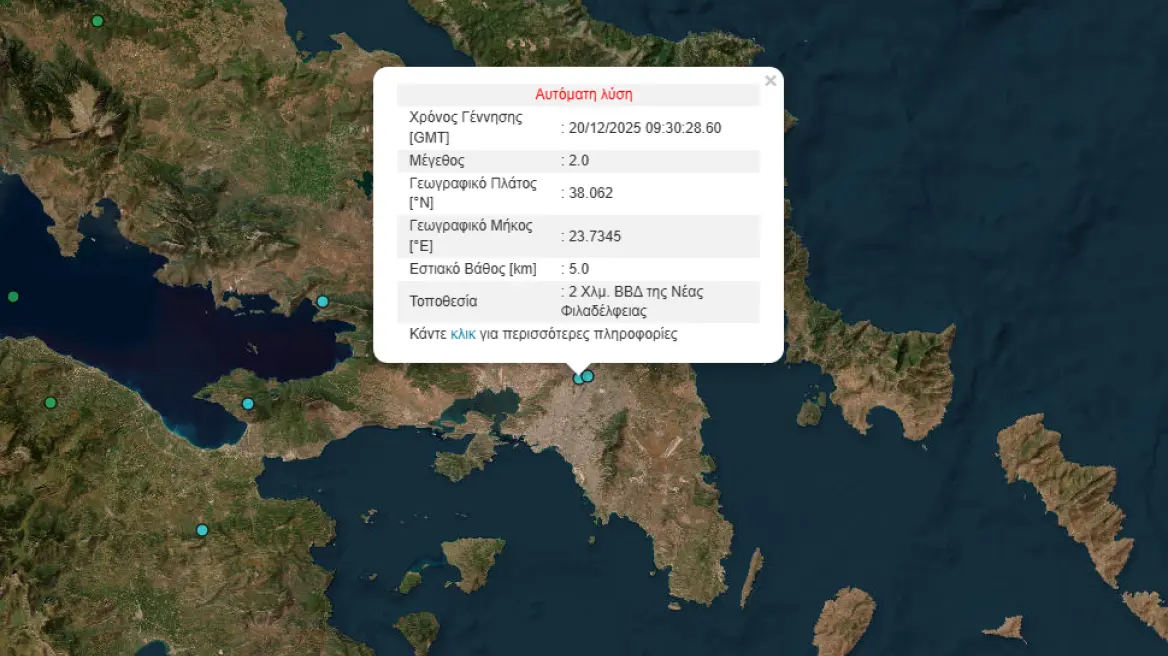 Το επίκεντρο εντοπίστηκε δύο χιλιόμετρα βόρειο-βορειοδυτικά της Νέας Φιλαδέλφειας, ενώ δεν έχουν αναφερθεί ζημιές ή τραυματισμοί.