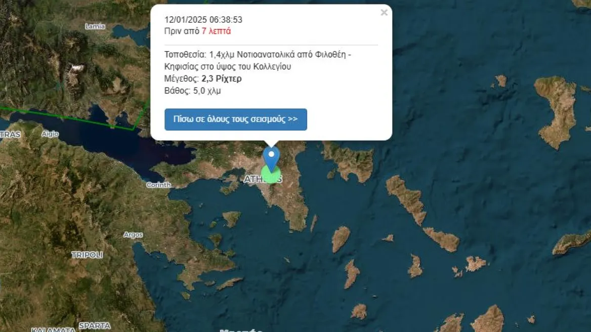 Σεισμός 2,3 βαθμών της κλίμακας Ρίχτερ σημειώθηκε νοτιοανατολικά από Φιλοθέη – Κηφισίας στο ύψος του Κολλεγίου και σε εστιακό βάθος 5,0 χιλιομέτρων.