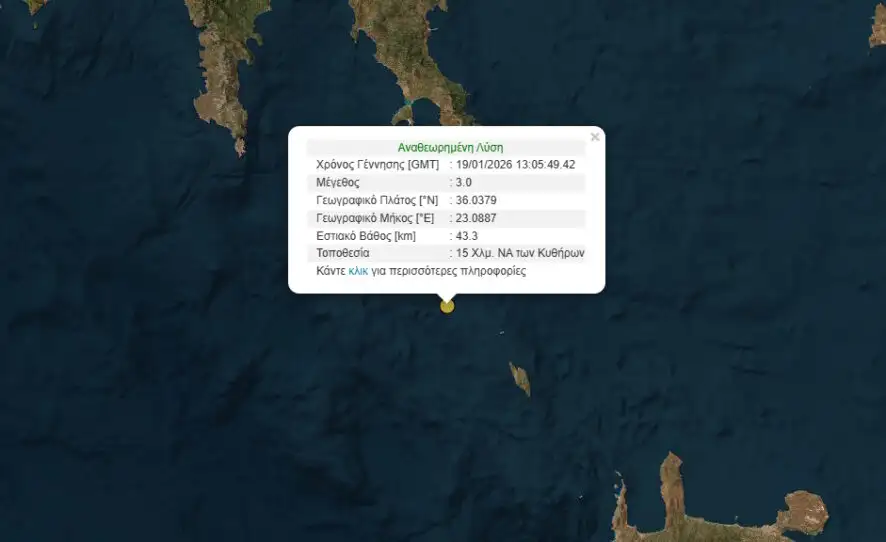 Ειδικότερα, από τον εστιακό χώρο που βρίσκεται σε απόσταση 15 χιλιομέτρων νοτιοανατολικά του νησιού προέρχεται ο σεισμός των 3 Ρίχτερ. Στα 43 χιλιόμετρα εντοπίζεται το εστιακό βάθος της σεισμικής δόνησης.