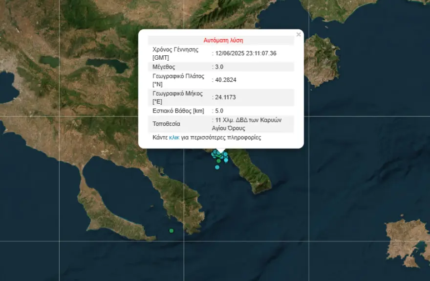 Το επίκεντρο τη δόνησης εντοπίζεται στα 11 χλμ. δυτικά βορειοδυτικά των Καρυών, σύμφωνα με την Αυτόματη Λύση του Γεωδυναμικού Ινστιτούτου.