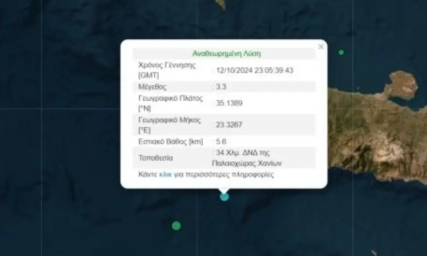 Ο σεισμός είχε ένταση 3,3 Ρίχτερ και σημειώθηκε στις 2:05 τα ξημερώματα της Κυριακής στη θαλάσσια περιοχή της Παλαιόχωρας στον νομό Χανίων.