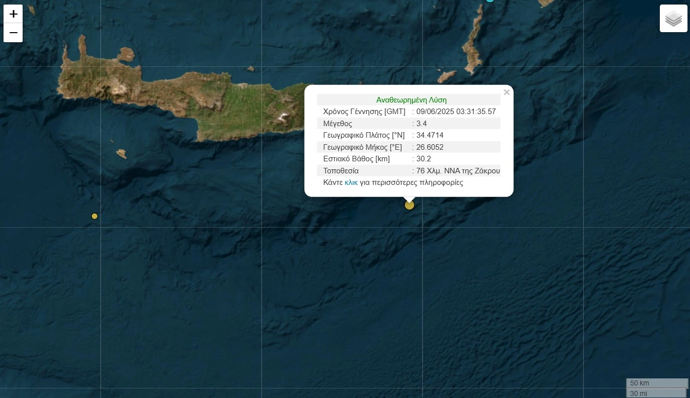 Το ακριβές επίκεντρο της δόνησης εντοπίζεται στα 94 χλμ. νοτιοανατολικά της Σητείας.