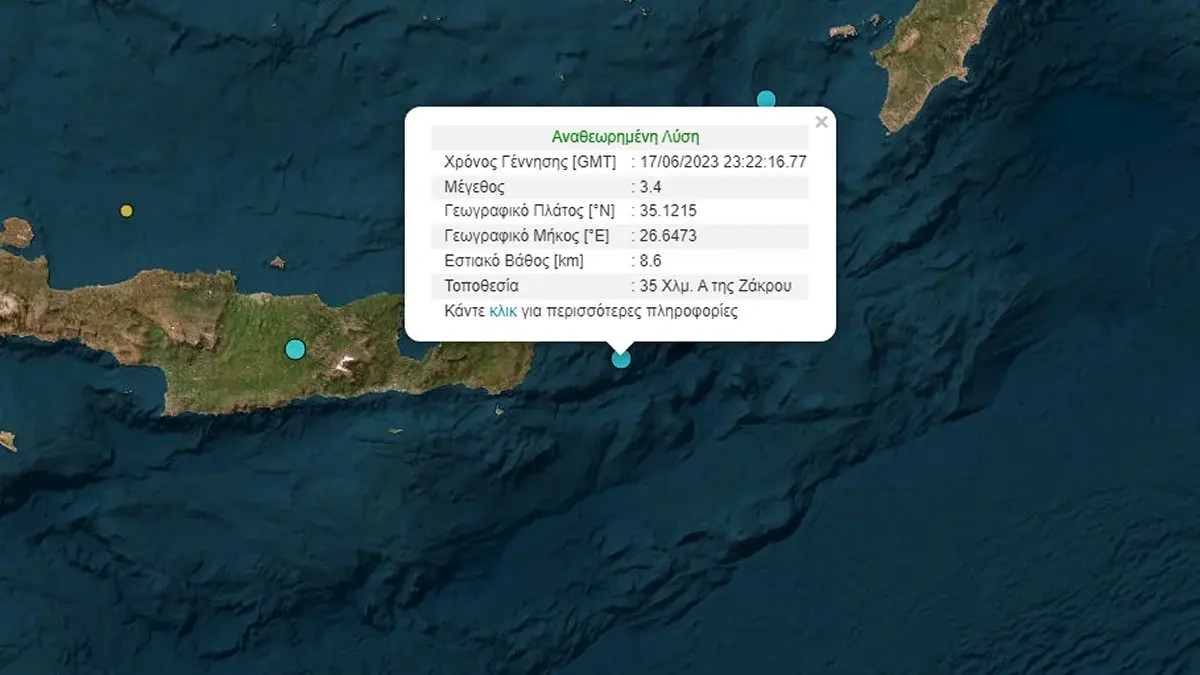 Σύμφωνα με την Αναθεωρημένη Λύση του Γεωδυναμικού Ινστιτούτου ο σεισμός, είχε επίκεντρο 35 χλμ ανατολικά της Ζάκρου, ενώ το εστιακό βάθος υπολογίζεται στα 8,6 χλμ.