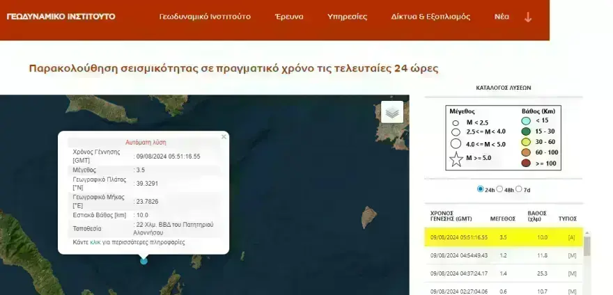 Συγκεκριμένα, το επίκεντρο του σεισμού εντοπίστηκε 22 χλμ βόρεια – βορειοδυτικά του Πατητηριού Αλοννήσου και το εστιακό βάθος ήταν 10 χλμ.