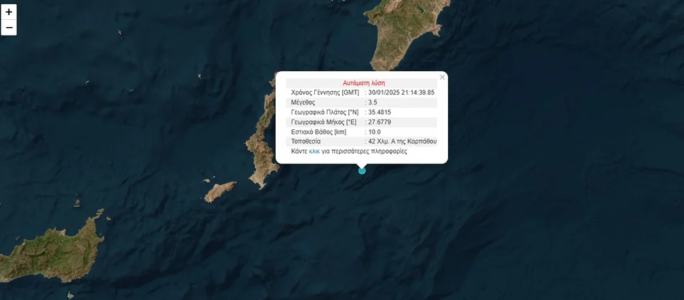 Σύμφωνα με το Γεωδυναμικό Ινστιτούτο, η σεισμική δόνηση σημειώθηκε σε εστιακό βάθος 10 Χλμ. και επίκεντρο στα 42 Χλμ. ανατολικά της Καρπάθου.