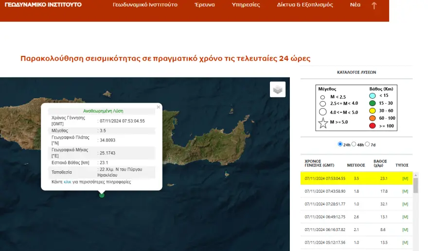 Σύμφωνα με το Γεωδυναμικό Ινστιτούτο, το επίκεντρο εντοπίζεται 22 χιλιόμετρα νότια του Ηρακλείου, σε εστιακό βάθος 23 χιλιομέτρων.