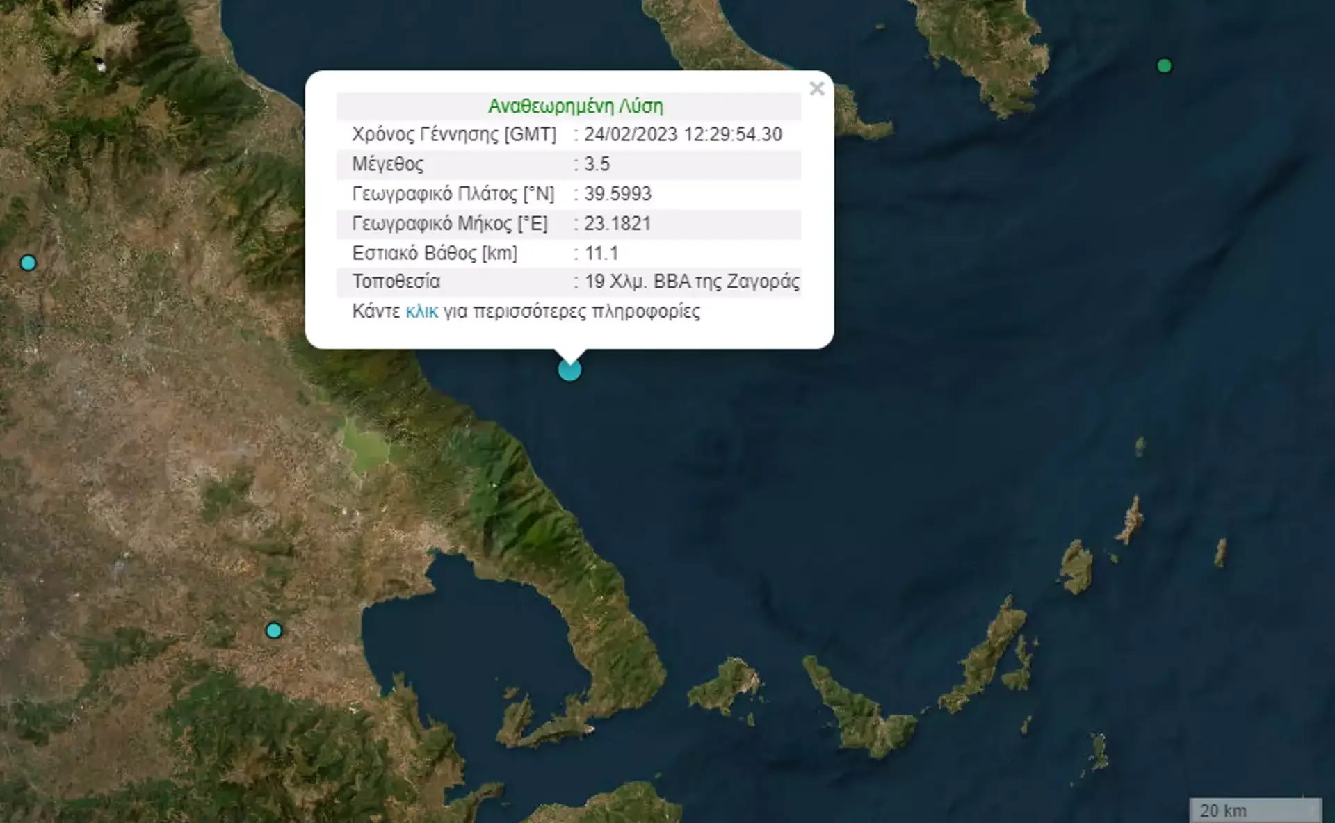 Συγκεκριμένα, ο σεισμός των 3,5 R κοντά στη Ζαγορά του Πηλίου σημειώθηκε στις 2:29 το μεσημέρι της Παρασκευής (24/2). Σύμφωνα με το Γεωδυναμικό Ινστιτούτο του Εθνικού Αστεροσκοπείου Αθηνών, η δόνηση προέρχεται από τον θαλάσσιο χώρο που βρίσκεται σε απόσταση 19 χιλιομέτρων βόρεια – βορειοανατολικά της Ζαγοράς.