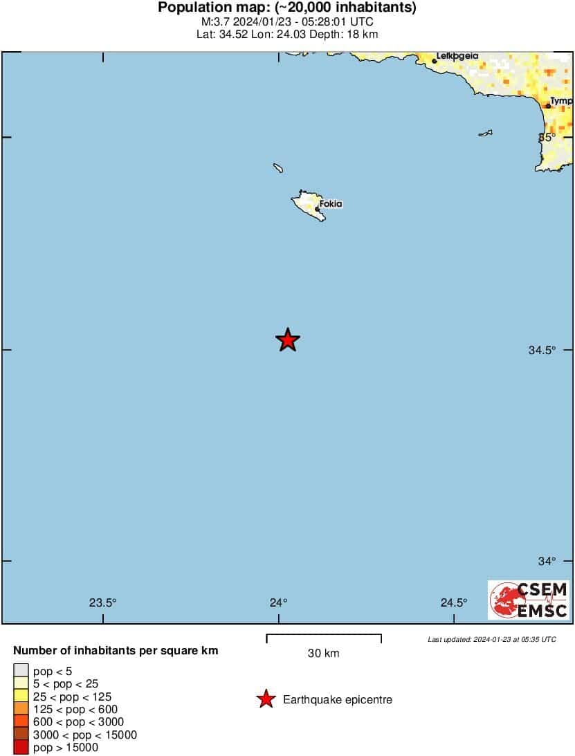 Το εστιακό βάθος του σεισμού, σύμφωνα με την αρχική εκτίμηση του EMSC, υπολογίζεται στα 18 χλμ.