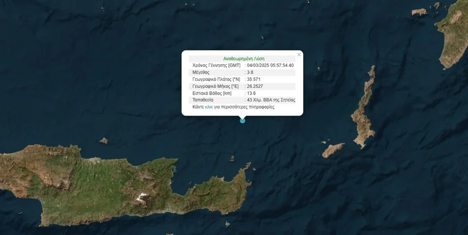 Σύμφωνα με τον Γεωδυναμικό Ινστιτούτο, το επίκεντρο της σεισμικής δόνησης, που καταγράφηκε στις 07:57, εντοπίστηκε 43 χιλιόμετρα βόρεια βορειοανατολικά της Σητείας, με το εστιακό βάθος να υπολογίζεται στα 13,6 χιλιόμετρα.