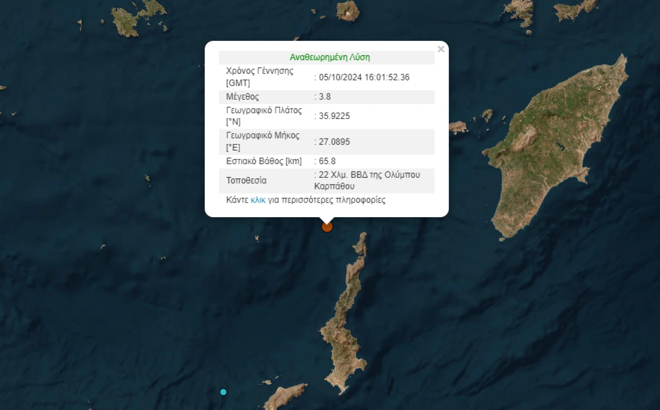 Σύμφωνα με το Γεωδυναμικό Ινστιτούτο, το εστιακό βάθος ήταν στα 65.8 χιλιόμετρα και το επίκεντρο εντοπίζεται στα 22 χιλιόμετρα βόρεια – βορειοδυτικά της Ολύμπου Καρπάθου.