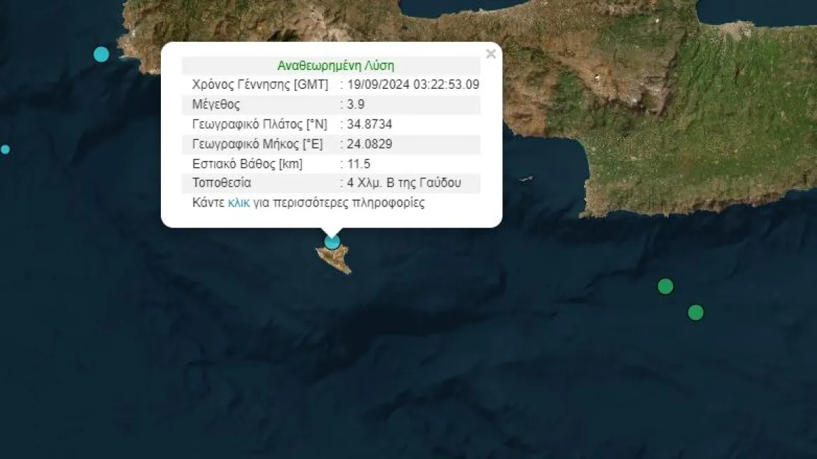 Το επίκεντρο του σεισμού εντοπίστηκε 4χλμ. βόρεια της Γαύδου και το εστιακό βάθος υπολογίστηκε στα 11,5χλμ.
