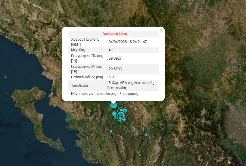 Σύμφωνα με την αυτόματη λύση του Γεωδυναμικού Ινστιτούτου το επίκεντρο του σεισμού εντοπίζεται στα 5 χιλιόμετρα ανατολικά, βορειοανατολικά της Λεπτοκαριάς Θεσπρωτίας με εστιακό βάθος 5 χιλιόμετρα.
