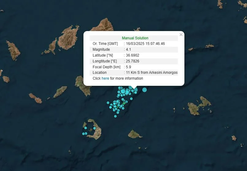 Το επίκεντρο της σεισμικής δόνησης εντοπίζεται στον θαλάσσιο χώρο 11 χιλιόμετρα νότια της Αρκεσίνης Αμοργού.