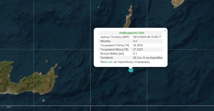Σύμφωνα με το Γεωδυναμικό Ινστιτούτο, η δόνηση καταγράφηκε στα 28 χιλιόμετρα νότια της Καρπάθου, ενώ το εστιακό βάθος ήταν στα 6,1 χιλιόμετρα.