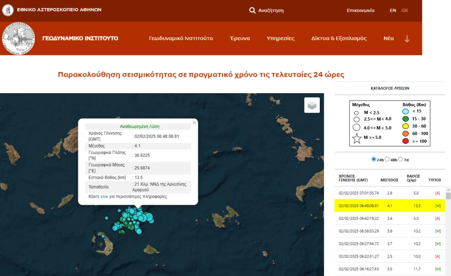 2. Το τελευταίο 24ωρο καταγράφεται στην περιοχή της Ανύδρου, μεταξύ Θήρας και Αμοργού, αυξημένη σεισμική ακολουθία με μέγιστο μέγεθος το 4.3. Αυτή η σεισμική δραστηριότητα δεν σχετίζεται με ηφαιστειακή δραστηριότητα, καθώς οφείλεται σε υποθαλάσσια ρήγματα με διεύθυνση ΒΑ-ΝΔ.
