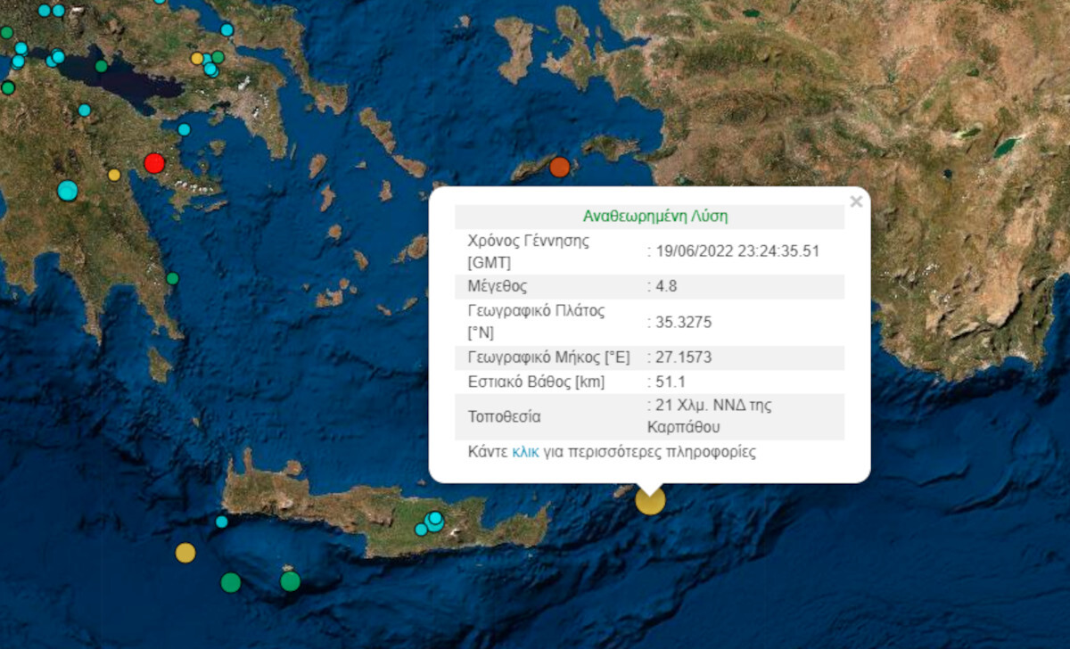 Σύμφωνα με το Γεωδυναμικό Ινστιτούτο του Αστεροσκοπείου Αθηνών, το επίκεντρο του σεισμού ήταν 21 χιλιόμετρα νότια-νοτιοδυτικά της Καρπάθου, ενώ το εστιακό βάθος υπολογίζεται στα 51,1 χιλιόμετρα.