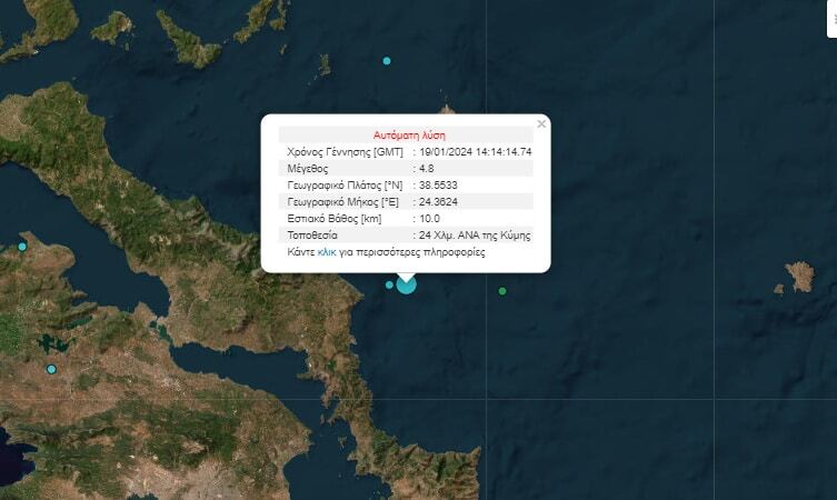 Ο σεισμός σύμφωνα με την αυτόματη λύση του Γεωδυναμικού Ινστιτούτου ήταν μεγέθους 4,8 βαθμών της κλίμακας Ρίχτερ ενώ το επίκεντρο του ήταν 24 χιλιόμετρα ανατολικά – νοτιοανατολικά της Κύμης και είχε εστιακός βάθος τα 10 χιλιόμετρα.