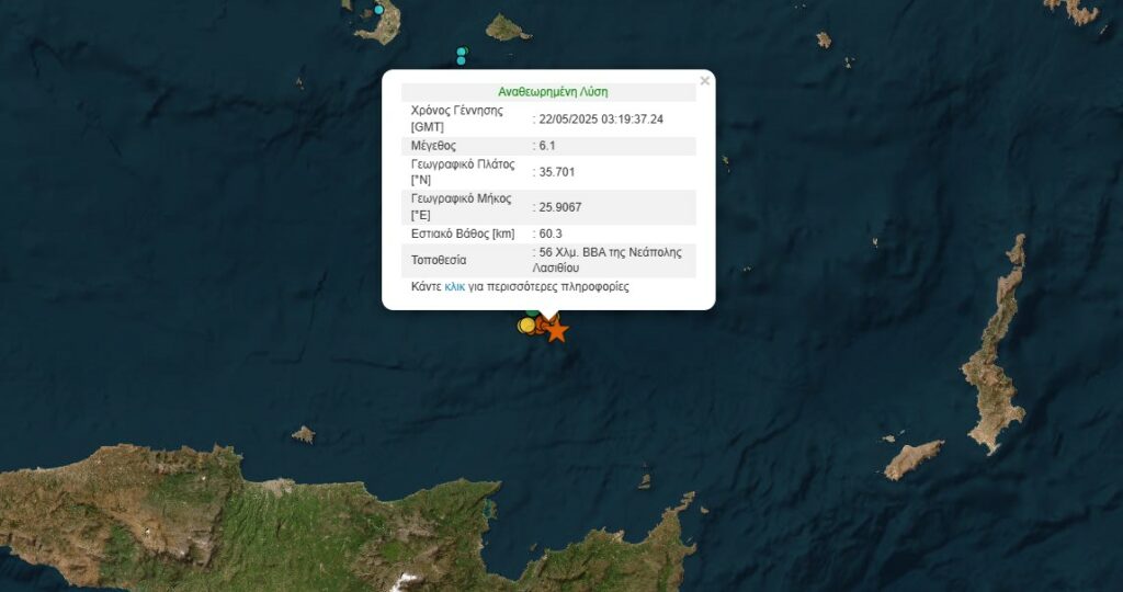 Ισχυρός σεισμός 6,1 ρίχτερ σημειώθηκε το πρωί της Πέμπτης 22 Μάϊου ανοιχτά της Κρήτης. Σύμφωνα με την πρώτη ανάλυση του Γεωδυναμικού Ινστιτούτου, ο σεισμός σημειώθηκε στις 6:19 το πρωί της Πέμπτης 57 χλμ βορειανατολικά του Λασιθίου.