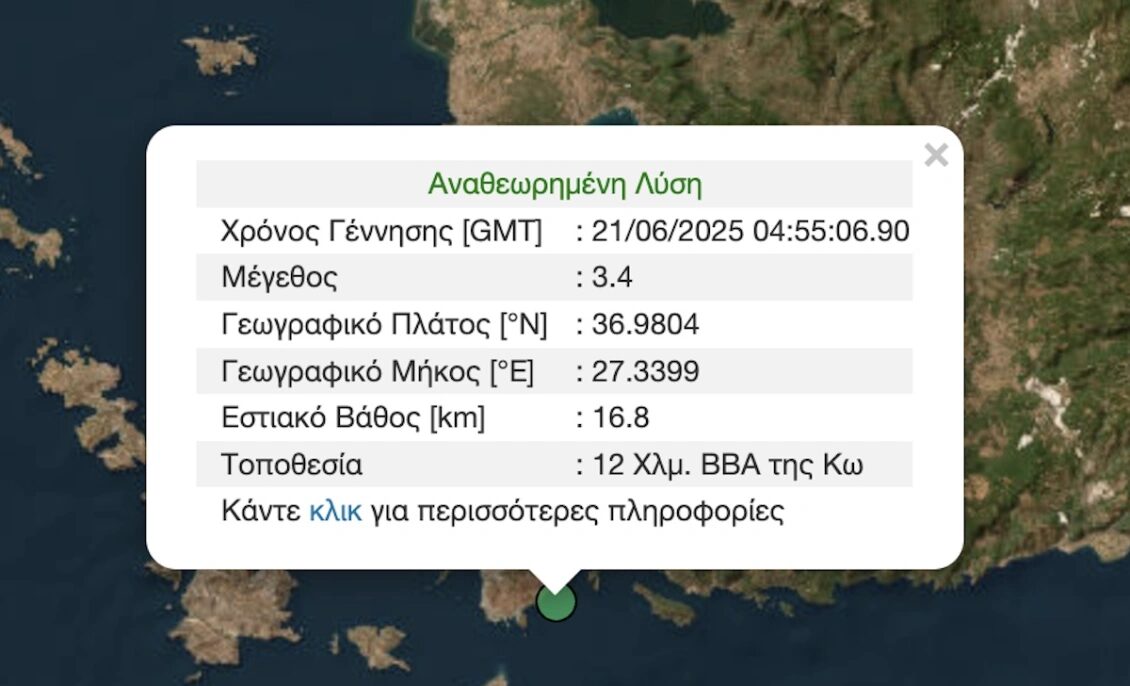 Σεισμός 3,4 Ρίχτερ σημειώθηκε, το πρωί του Σαββάτου 21 Ιουνίου, στα ανοιχτά της Κω. Συγκεκριμένα, σύμφωνα με την αναθεωρημένη λύση του Γεωδυναμικού Ινστιτούτου, ο σεισμός έγινε στις 07:55 με επίκεντρο τα 12 χιλιόμετρα βόρεια-βορειοανατολικά της Κω.