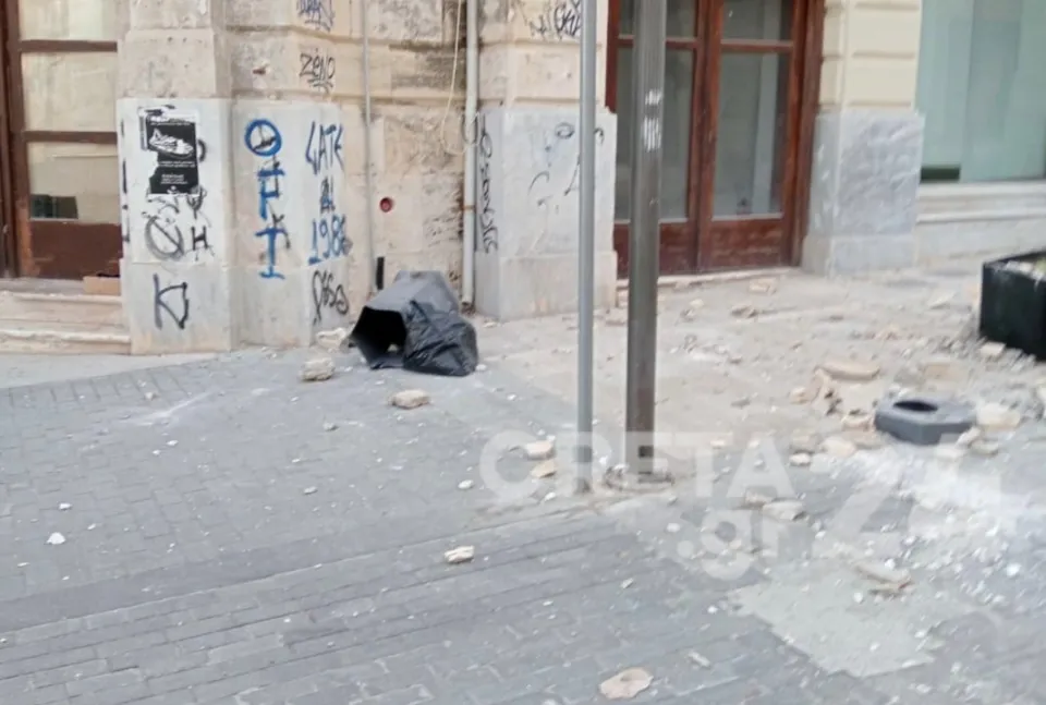Κομμάτια του κτηρίου έπεσαν στον κεντρικό πεζόδρομο, χωρίς – ευτυχώς – να υπάρξουν τραυματισμοί.
