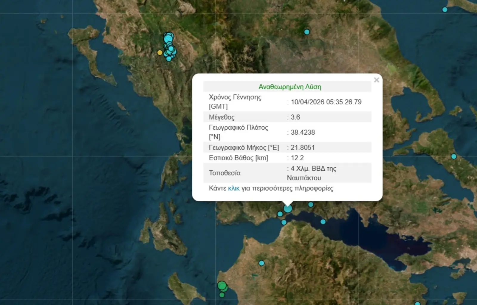Ειδικότερα, σύμφωνα με την αυτόματη λύση του Γεωδυναμικού Ινστιτούτου του Εθνικού Αστεροσκοπείου Αθηνών, ο σεισμός είχε μέγεθος 3,5 βαθμών της κλίμακας Ρίχτερ και το επίκεντρο εντοπίστηκε ένα χιλιόμετρο, δυτικά της Ναυπάκτου.