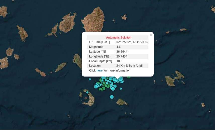 Σύμφωνα με την αυτόματη λύση του Γεωδυναμικού Ινστιτούτου, στις 19:41 σημειώθηκε σεισμός 4,6 Ρίχτερ 24 χιλιόμετρα βόρεια της Ανάφης.