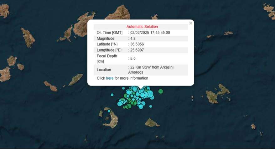 Σύμφωνα με την αυτόματη λύση του Γεωδυναμικού Ινστιτούτου, σημειώθηκε σεισμός 4,8 Ρίχτερ 22 χιλιόμετρα νότια-νοτιοδυτικά της Αμοργού στις 19:45.