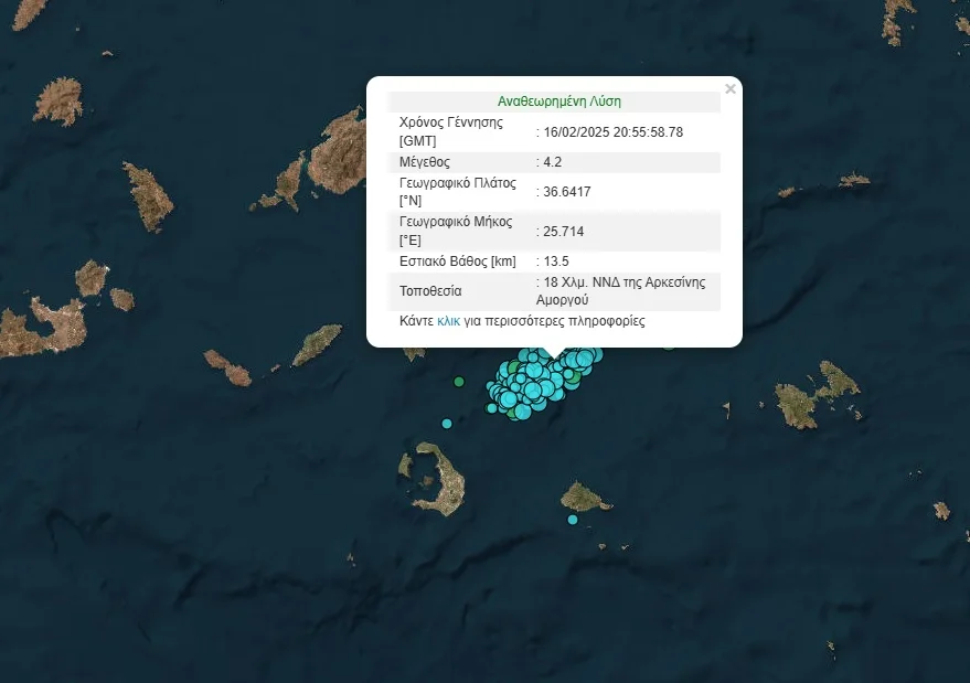 Η σεισμική δόνηση σημειώθηκε 18 Χλμ. Νότια-νοτιοδυτικά της Αρκεσίνης Αμοργού και είχε εστιακό βάθος 13,5 χλμ..