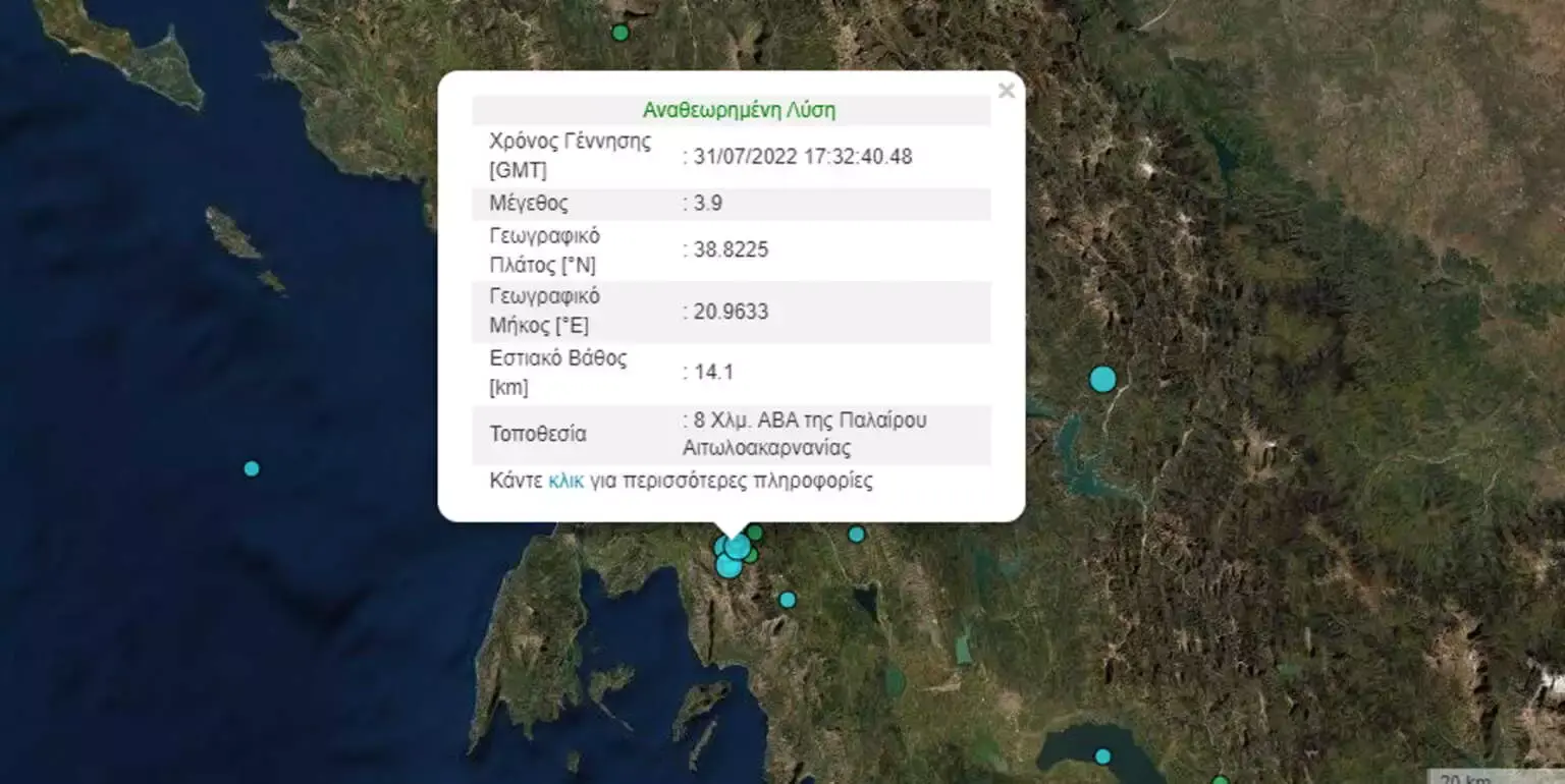 Ο σεισμός των 3,9 R στην Αιτωλοακαρνανία σημειώθηκε 32′ λεπτά μετά τις 8 το βράδυ της Κυριακής (31/7/2022). Σύμφωνα με το Γεωδυναμικό Ινστιτούτο του Εθνικού Αστεροσκοπείου Αθηνών, το επίκεντρο βρίσκεται σε απόσταση 8 χιλιομέτρων ανατολικά – βορειοανατολικά της Παλαίρου.