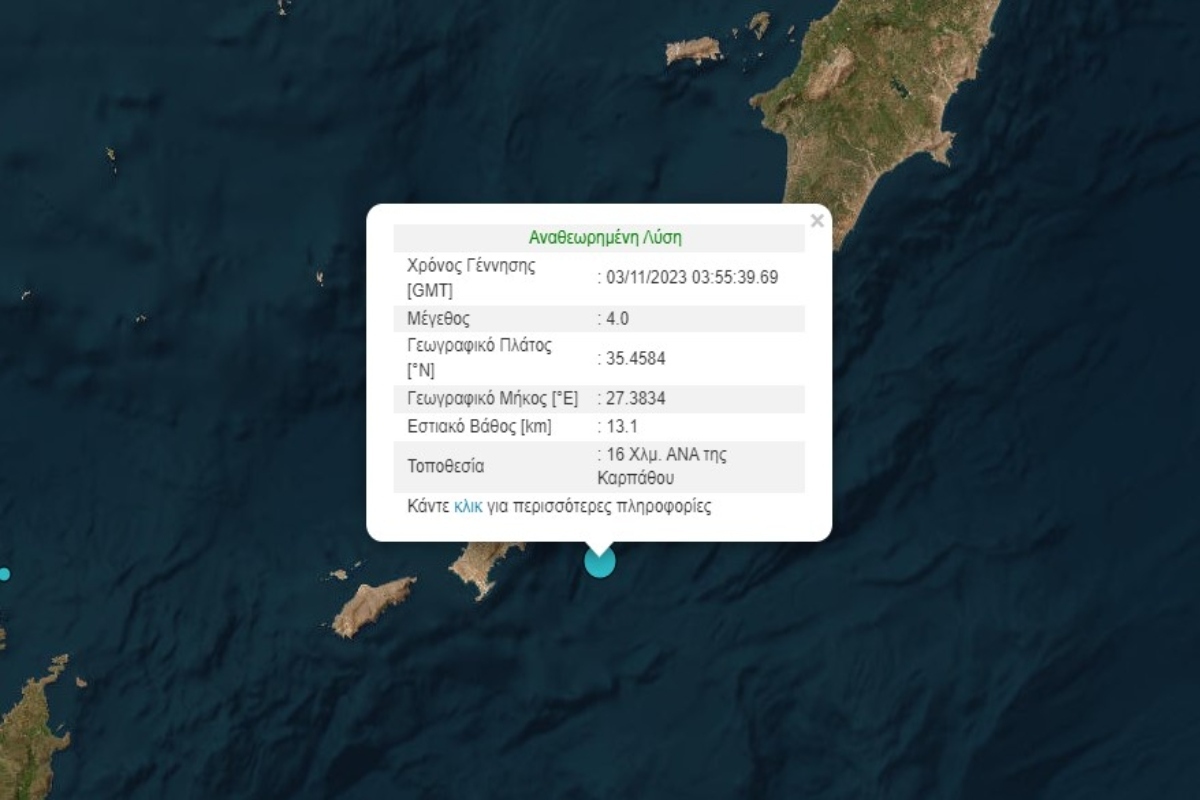 Σεισμική δόνηση 4,0 βαθμών της κλίμακας Ρίχτερ, που χαρακτηρίζεται «ασθενής», καταγράφτηκε στις 05:55 στον θαλάσσιο χώρο 29 χιλιόμετρα νοτιοανατολικό της Καρπάθου, σύμφωνα με δεδομένα του Γεωδυναμικού Ινστιτούτου του Εθνικού Αστεροσκοπείου της Αθήνας.