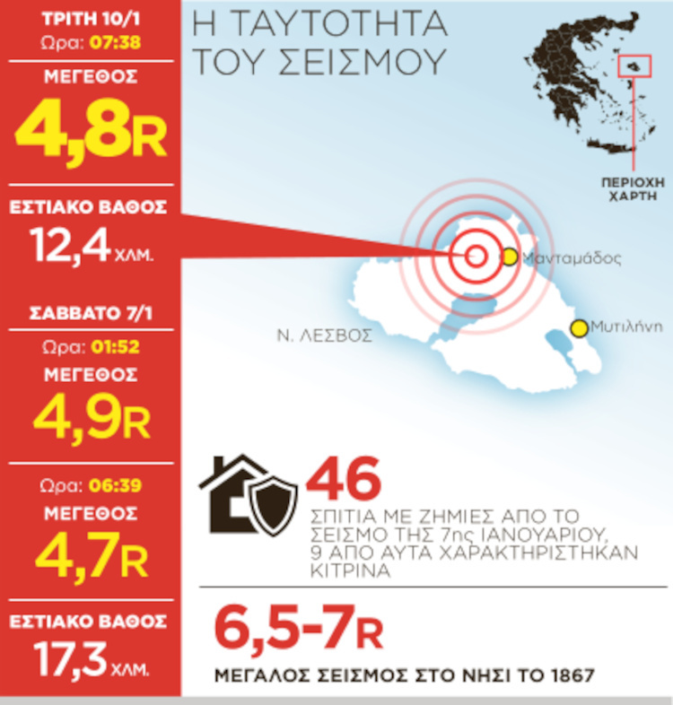 Σύμφωνα με το Γεωδυναμικό Ινστιτούτο του Εθνικού Αστεροσκοπείου Αθηνών, η ισχυρή σεισμική δόνηση 4,8 ρίχτερ σημειώθηκε στις 09:38 το πρωί της Τρίτης στη Λέσβο. Το επίκεντρο του σεισμού εντοπίζεται 5 χιλιόμετρα ανατολικά νοτιοανατολικά της Μήθυμνας, ενώ το εστιακό βάθος υπολογίζεται σε 12,4 χιλιόμετρα. Ο σεισμός έγινε αισθητός σε όλο το νησί και ιδιαίτερα στα χωριά της Βόρειας Λέσβου, με τους κατοίκους να βγαίνουν στους δρόμους.