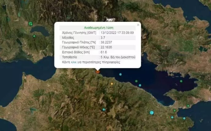 Σύμφωνα με το Γεωδυναμικό Ινστιτούτο του Εθνικού Αστεροσκοπείου Αθηνών, ο σεισμός είχε επίκεντρο 5 χιλιόμετρα βορειοδυτικά του Διακοφτού και το εστιακό του βάθος ήταν στα 61,6 χιλιόμετρα. Έγινε αισθητός στην Αχαΐα.
