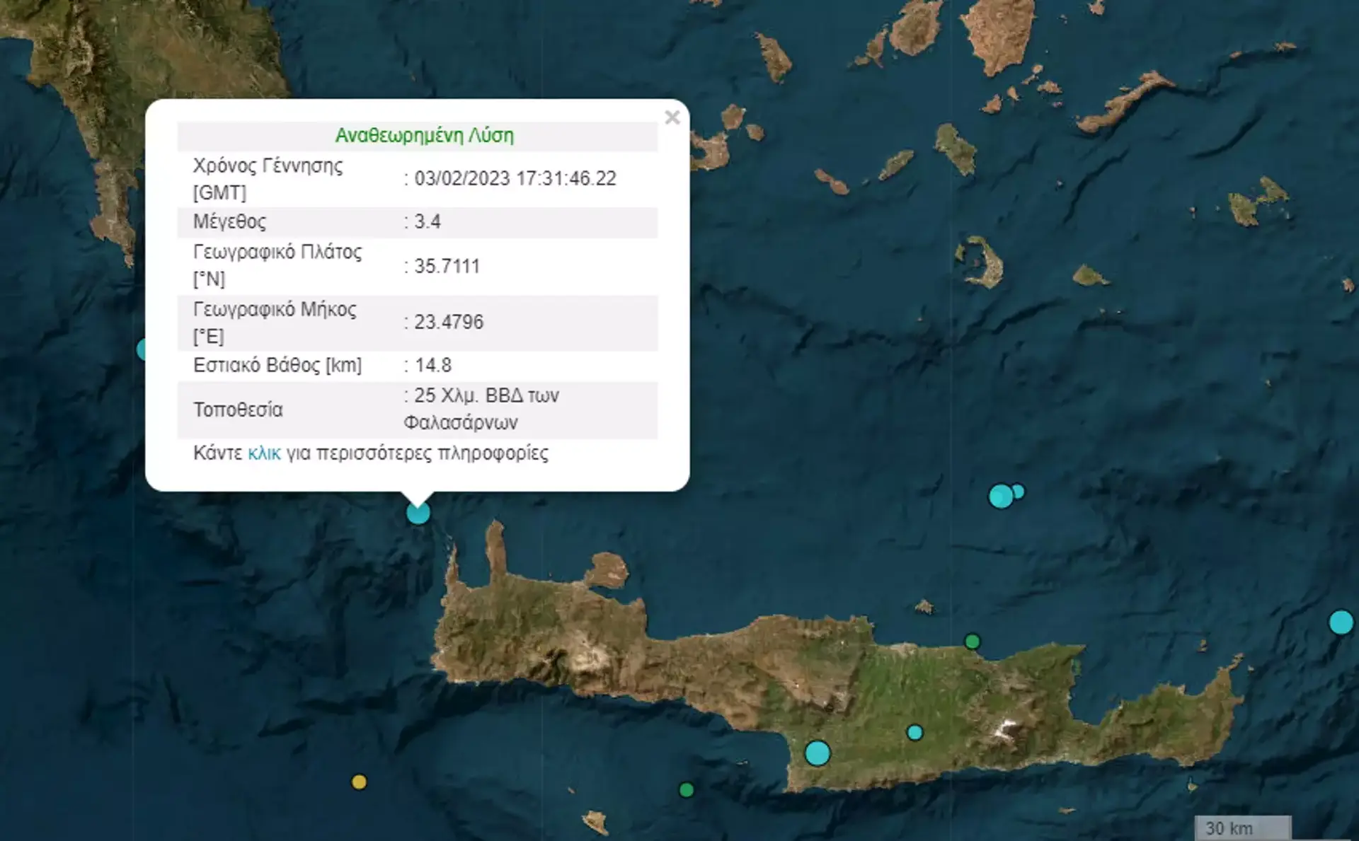 Ο σεισμός των 3,4 R στη δυτική Κρήτη προέρχεται από τον εστιακό χώρο που βρίσκεται σε απόσταση 25 χιλιομέτρων βόρεια – βορειοδυτικά από τα Φαλάσαρνα στα Χανιά, σύμφωνα με το Γεωδυναμικό Ινστιτούτο του Εθνικού Αστεροσκοπείου Αθηνών.
