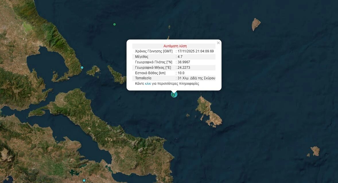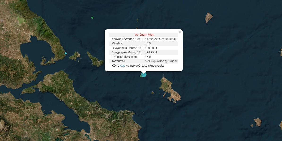 Σεισμός μεγέθους 4,5 Ρίχτερ σημειώθηκε στις 21:04 (ώρα Ελλάδας), σύμφωνα με την αυτόματη λύση του Γεωδυναμικού Ινστιτούτου. Το επίκεντρο εντοπίστηκε 29 χιλιόμετρα δυτικά-βορειοδυτικά της Σκύρου, σε θαλάσσια περιοχή του Αιγαίου, ενώ το εστιακό βάθος υπολογίζεται στα 5 χιλιόμετρα.