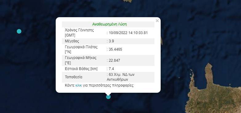 Ο σεισμός ήταν μεγέθους 3,9 βαθμών της κλίμακας Ρίχτερ και έγινε 10′ λεπτά μετά τις 5 το απόγευμα του Σαββάτου. Το επίκεντρο εντοπίζεται σε απόσταση 63 χιλιομέτρων νότια των Αντικυθήρων στο ύψος της δυτικής Κρήτης, σύμφωνα με το Γεωδυναμικό Ινστιτούτο του Εθνικού Αστεροσκοπείου Αθηνών.