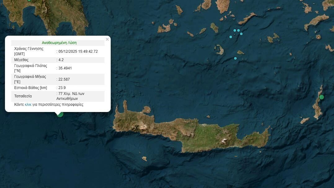 Ο σεισμός των 4,2 Ρίχτερ – σύμφωνα με το Γεωδυναμικό Ινστιτούτο του Εθνικού Αστεροσκοπείου Αθηνών – καταγράφηκε από τους σεισμογράφους του στις 5:49 μ.μ. της Παρασκευής. Το επίκεντρο της σεισμικής δόνησης εντοπίζεται στη θαλάσσια περιοχή που βρίσκεται σε απόσταση 77 χιλιομέτρων νοτιοδυτικά των Αντικυθήρων και δυτικά της Κρήτης. Το εστιακό βάθος είναι στα 23,9 χιλιόμετρα.