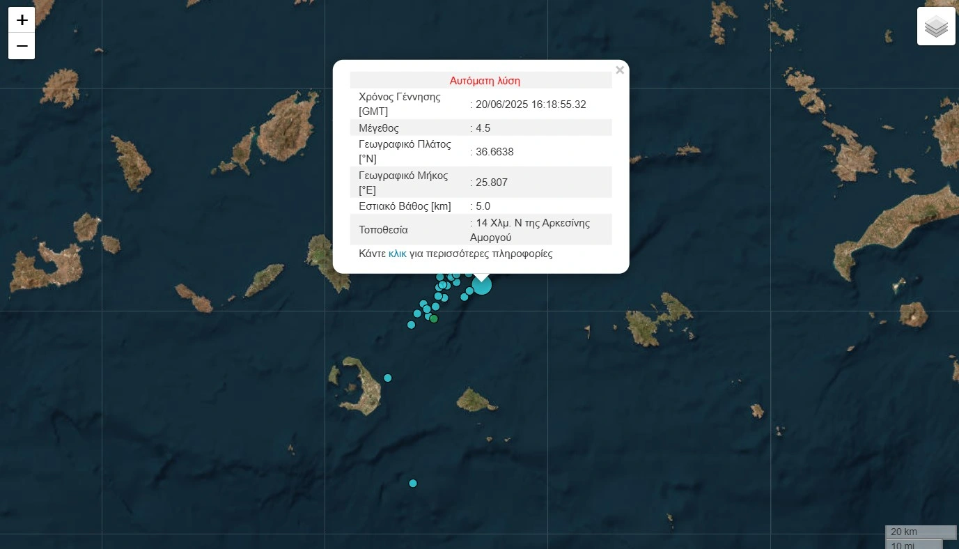 Σύμφωνα με την αυτόματη λύση του Γεωδυναμικού Ινστιτούτου Αθηνών, το επίκεντρο του σεισμού εντοπίζεται στη θαλάσσια περιοχή 13 χιλιόμετρα νότια νοτιοδυτικά της Αρκεσίνης Αμοργού, ενώ το εστιακό βάθος εκτιμάται στα 5,5 χιλιόμετρα.