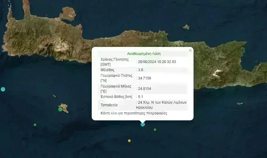 Σύμφωνα με την αναθεωρημένη λύση του Γεωδυναμικού Ινστιτούτου, το επίκεντρο του σεισμούς εντοπίζεται 24 χλμ νότια των Καλών Λιμένων Ηρακλείου και το εστιακό βάθος υπολογίζεται στα 5,1 χλμ.