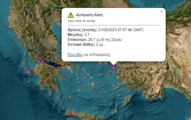 Όπως αναφέρει το Γεωδυναμικό Ινστιτούτο, το επίκεντρο της σεισμικής δόνησης εντοπίζεται 26,7 χιλιόμετρα βόρεια της Σάμου και το εστιακό βάθος στα 2 χιλιόμετρα.