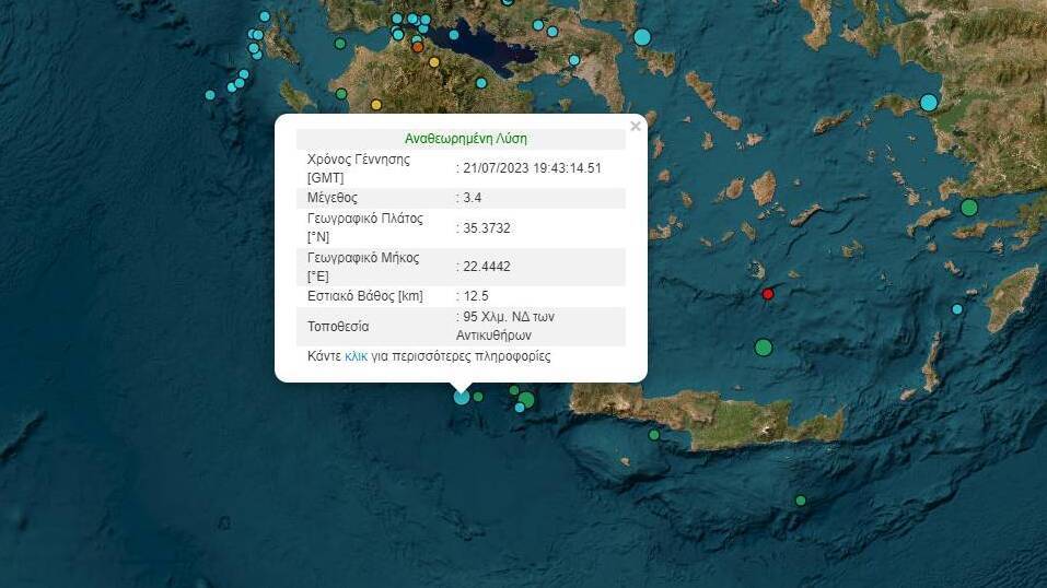 Ειδικότερα, σύμφωνα με το Γεωδυναμικό Ινστιτούτο, η σεισμική δόνηση εντοπίζεται 95 χιλιόμετρα Νοτιοδυτικά των Αντικυθήρων, με εστιακό βάθος 12,5 χιλιομέτρων.