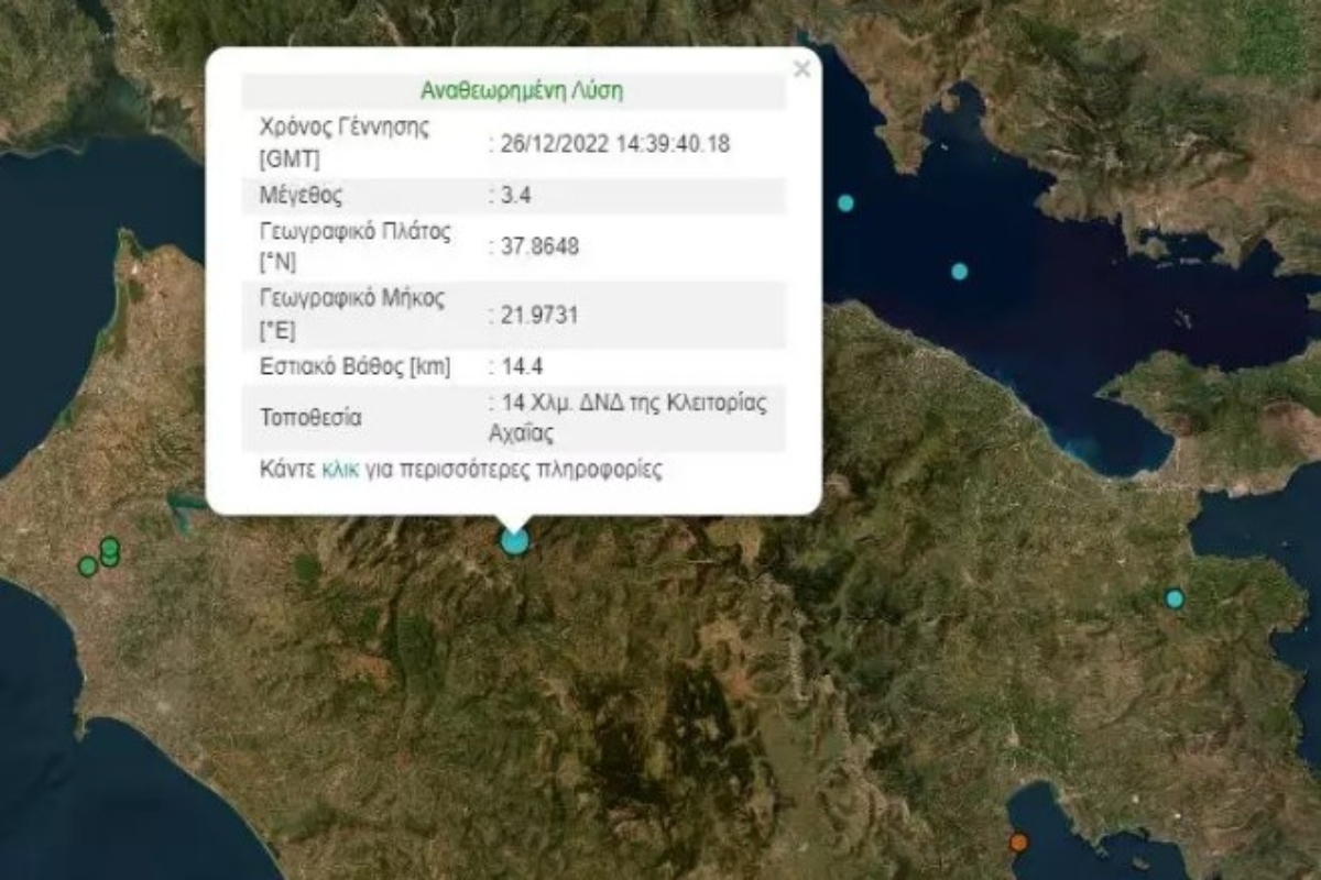 Ο σεισμός σημειώθηκε περίπου στις 16:40 σήμερα (26.12.2022) και το επίκεντρό του εντοπίζεται 14 χιλιόμετρα δυτικά, νοτιοδυτικά της Κλειτορίας, στην περιοχή των Καλαβρύτων, σύμφωνα με το Γεωδυναμικό Ινστιτούτο του Εθνικού Αστεροσκοπείου Αθηνών.
