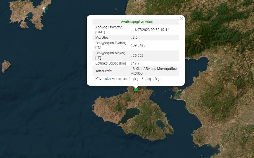 Το επίκεντρο εντοπίζεται στα 8 χιλιόμετρα Βορειοδυτικά του Μανταμάδου Λέσβου ενώ το εστιακό βάθος στα 17.7 χιλιόμετρα.
