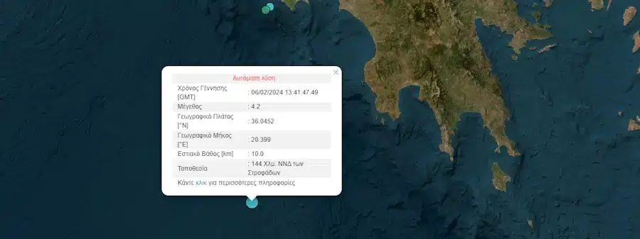 Σύμφωνα με την αυτόματη λύση του Γεωδυναμικού Ινστιτούτου, ο σεισμός έγινε στις 15:41 με επίκεντρο τα 144 χιλιόμετρα νότια – νοτιοδυτικά των Στροφάδων. Ακόμα, το εστιακό βάθος του σεισμού υπολογίστηκε σε μόλις 10 χιλιόμετρα.